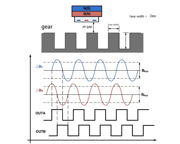 隨著齒輪從齒頂、齒谷的運轉(zhuǎn)變換,這個差分磁場信號的極性也會以相同的速度改變,相應(yīng)的磁場變化量通過內(nèi)部信號處理電路轉(zhuǎn)化為電壓信號并去觸發(fā)和控制輸出級電路,使其在導(dǎo)通(輸出低電平)和截止(輸出高電平)狀態(tài)之間進(jìn)行轉(zhuǎn)換。