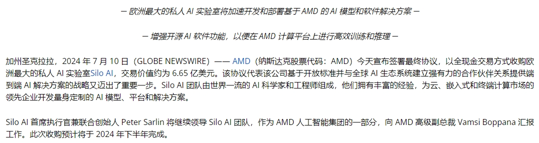 據(jù)悉,AMD當(dāng)日在其官網(wǎng)宣布,已與Silo AI簽署最終協(xié)議,將以全現(xiàn)金交易方式收購Silo AI,交易價值約為6.65億美元,此次收購預(yù)計將于2024年下半年完成,不過仍須獲得監(jiān)管機(jī)構(gòu)批準(zhǔn)。